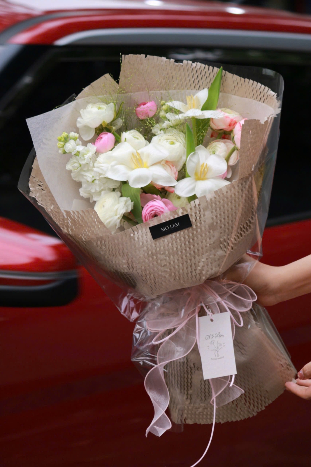 Tại Mờ Lem Florist, chúng tôi luôn nỗ lực mang đến những bó hoa tươi đẹp nhất, được thiết kế tỉ mỉ theo yêu cầu của khách hàng. Vì hoa là sản phẩm tươi và không có sẵn, quý khách vui lòng đặt trước ít nhất 2-3 tiếng để chúng tôi chuẩn bị nguyên liệu và thực hiện cắm hoa theo đúng ý muốn của bạn.