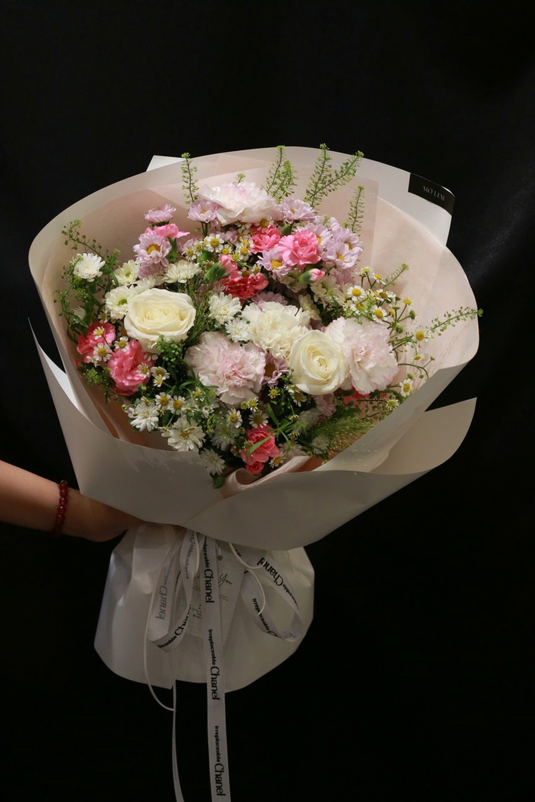 Kết hợp các loại hoa cao cấp: Hồng Ecuador, cẩm chướng, baby, cúc họa mi.
